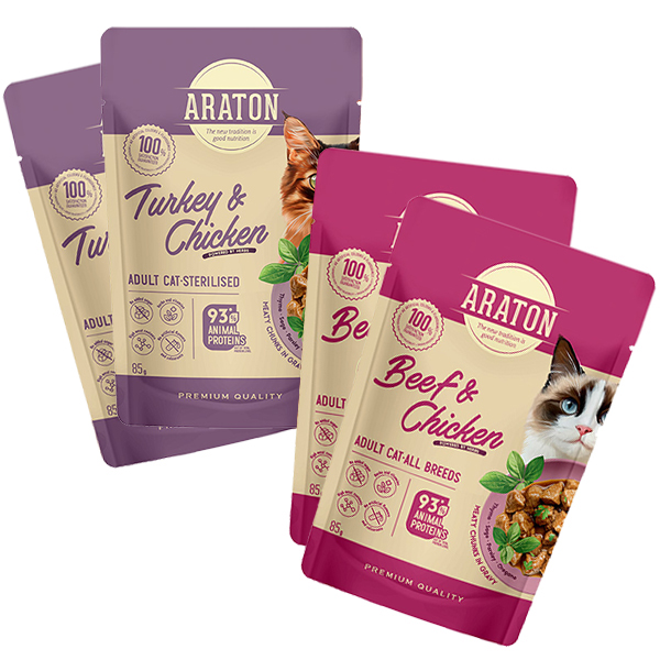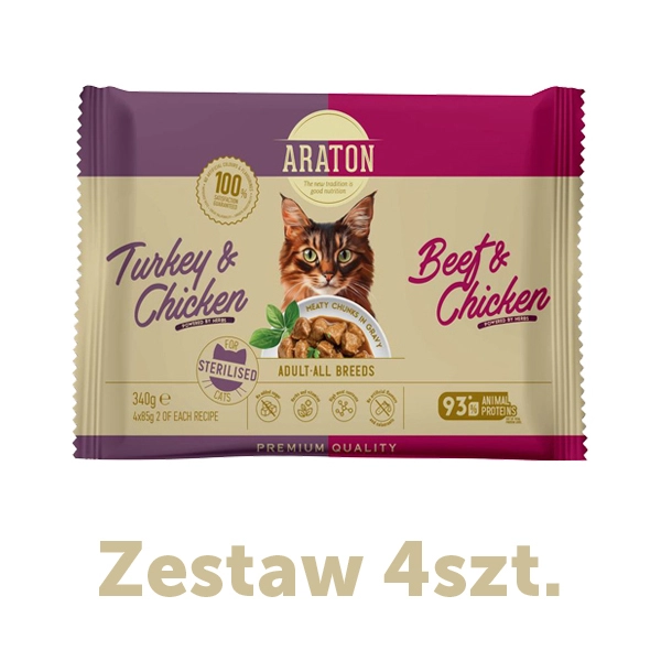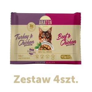 ARATON Adult Sterilised Cat Set (2x beef and chicken, 2x turkey and chicken), 4x85g sasz.ZESTAW
