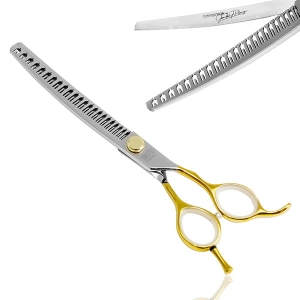 KLASYCZNE NOŻYCZKI GROOMERSKIE DEGAŻÓWKI GIĘTE CHUNKERS DLA LEWORĘCZNYCH, 18 cm, 23 ząbki, 7 cali, japońska stal nierdzewna 440c, kolor SREBRNY ZE ZŁOTYM UCHWYTEM, Perfection by Janita J. Plunge