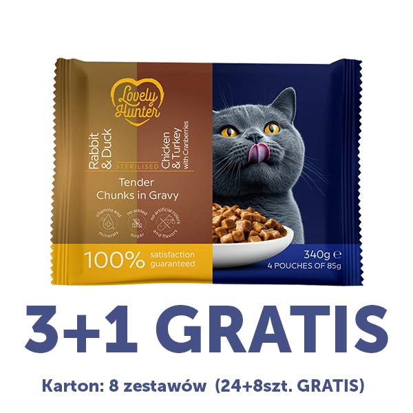 LOVELY HUNTER Sterilised Adult Cat Set (2x Chicken, Turkey, Cranberry, 2x Rabbit Duck), 8x 3+1 85g sasz. ZESTAW BOX
