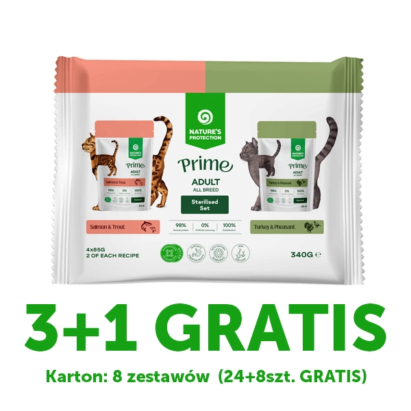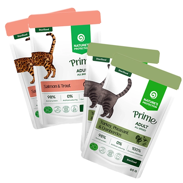 NP PRIME Sterilised Adult Cat Set (2x Turkey, Pheasant and Cranberries, 2x Salmon and Trout), 8x3+1 85g sasz. ZESTAW BOX