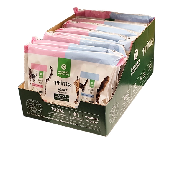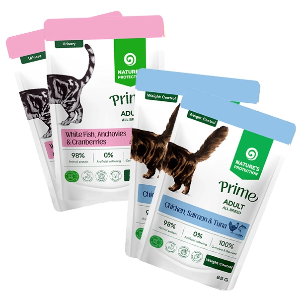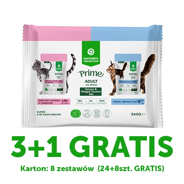 NP PRIME Urinary & Weight Control Adult Cat Set (2x White Fish, Anchovies and Cranberries, 2x Chicken, Salmon and Tuna), 8x3+1 85g sasz. ZESTAW BOX