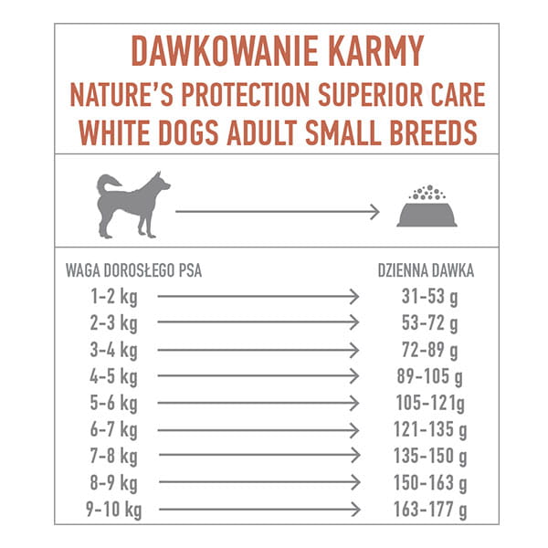 Aby uzyskać jak najlepsze wyniki, zalecamy karmić psa tylko Superior Care White Dogs, gdyż inna żywność może mieć wpływ na brązowienie sierści i w tym przypadku nie będzie widać żądanych wyników.