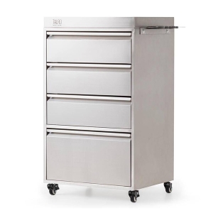 Cztery pojemne szuflady pozwalają na wygodne przechowywanie narzędzi, kosmetyków, ściereczek i innych przyborów, a boczny uchwyt jest przeznaczony na suszarkę, nożyczki lub butelki z rozpylaczem.