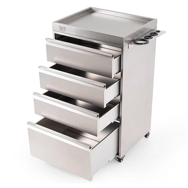 Wysokiej jakości szafka ze stali nierdzewnej z kółkami, szufladami i zintegrowanym uchwytem na narzędzia – dla wygodnej, higienicznej i profesjonalnej pracy.
